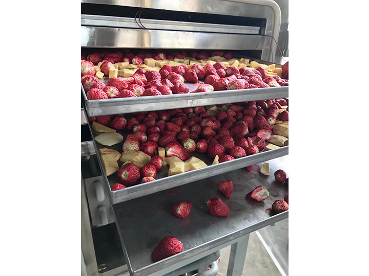 開(kāi)機(jī)后將物料投入物料箱內(nèi)進(jìn)行冷凍.物料的冷凍過(guò)程.一方面是真空系統(tǒng)進(jìn)行抽真空把一部分水份帶走;另一方面是物料受凍時(shí)把某些分子中所含水份排到物料的表面凍結(jié).達(dá)到冷凍要求后,由加熱系統(tǒng)對(duì)物料加熱干燥,通過(guò)抽真空把物料中所含的水份帶到冷凍捕集箱結(jié)凍,達(dá)到物料冷凍干燥要求。